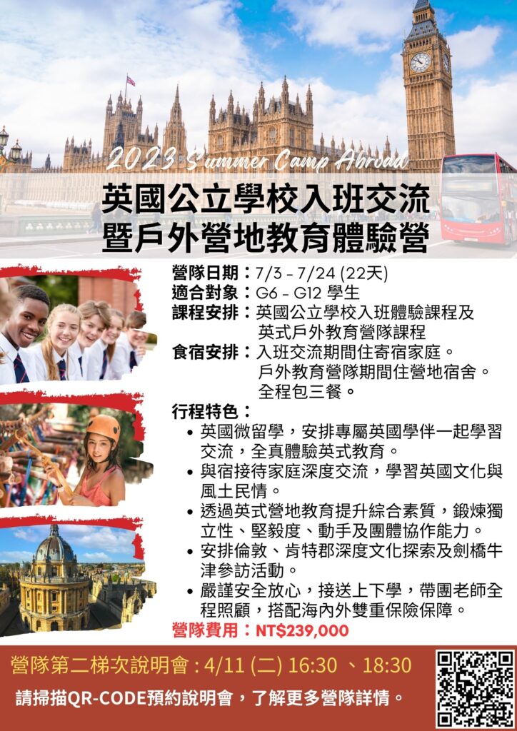 今年的有得海外夏令營是由本機構委託博德留學公司設計與規劃,並將由有得師長帶隊前往。相信參加本次海外營隊的的有得學子會對英國學校入班學習和戶外營隊留下深刻的回憶。