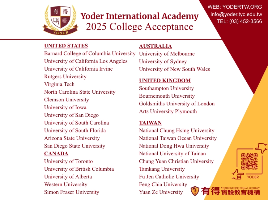大學錄取名單 桃園市有得實驗教育機構第一屆高中部學生於2022年6月完成在本機構學業,順利取得桃園市教育局所頒發的『完成實驗教育證明』。如今第四屆 (Class of 2025) 的學生也預計於2025年6月完成在本機構的學業。以下是今年畢業生升學進路: 有得實驗教育機構歷屆畢業生獲入學許可的世界大學分佈圖: